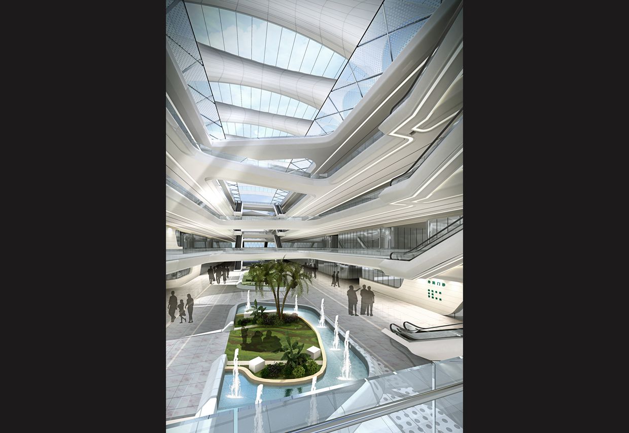 方案功能分区设计明确清晰,门诊、医技、病房三者呈夹心式布局,办公教学区设于病房楼南侧,各功能联系方便快捷。门诊置于西侧,可迎合由城区过来的人流,病房置于东侧,既远离了噪声,又为病房创造了良好的沿河景观。病房楼设于基地东侧并沿河展开,这样病房楼既远离西、北侧的商业和城市干道,减小噪音干扰,又将东侧的自然景观引入到病房,同时病房楼沿街展开,创造良好的城市形象。基地内有两栋保留文物建筑,通过我们设计,将原有两栋保留建筑置于门诊广场旁边的绿地之中,并结合景观将其完美的融合到院区之中。院区中央设置贯通南北的绿化景观带,使得院南北广场串联起来,并与保留的廷仲书舍形成对景,从而创造出更加丰富的空间环境。