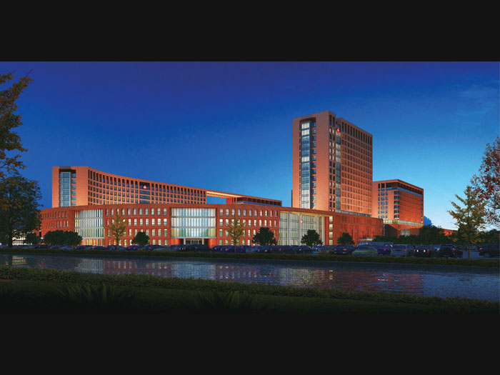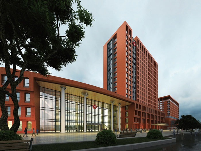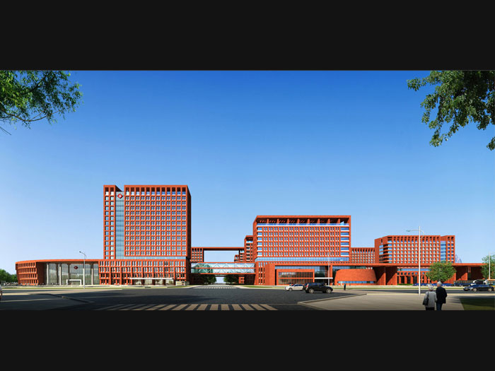 沧州渤海新区中捷医院规划包括1500床医院、办公科研区、康复疗养区、托老区和防保中心等多种功能,总用地面积16公顷。设计采用集中与分散相结合的方